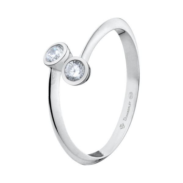 Clásico Solitario de Compromiso en oro blanco pulido de 18 kts. de la marca Diamberley. La joya tiene dos diamantes talla brillante engastado con diferentes quilates a elegir.