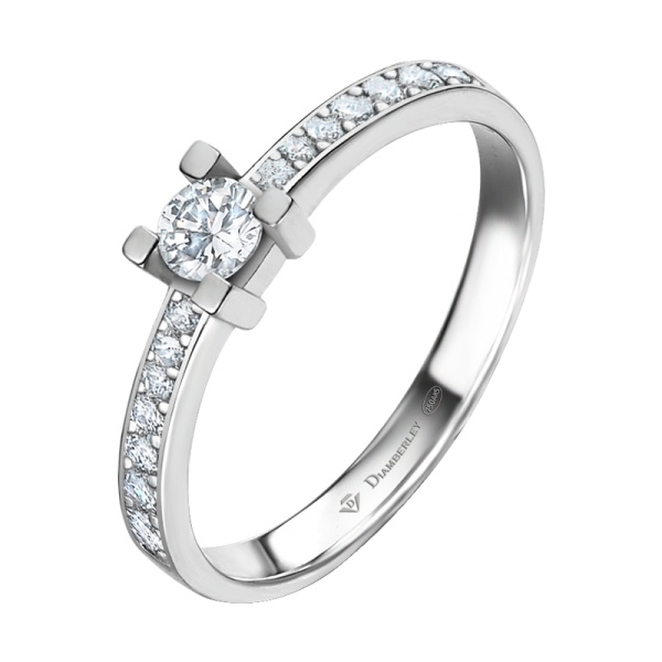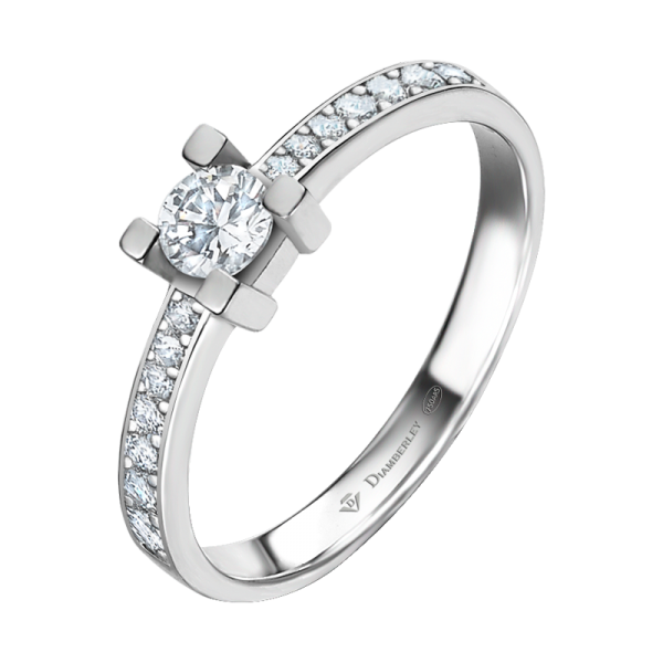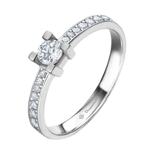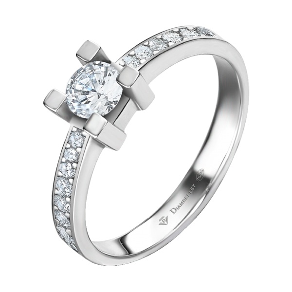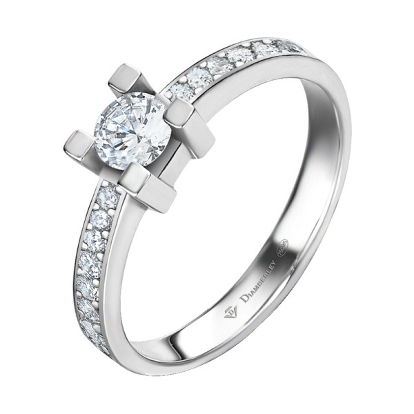 Clásico Solitario de Compromiso en oro blanco pulido de 18 kts. La joya tiene un diamante central talla brillante engastado en 4 garras y dos filas de diamantes más pequeños en el brazo con diferentes quilates a elegir.