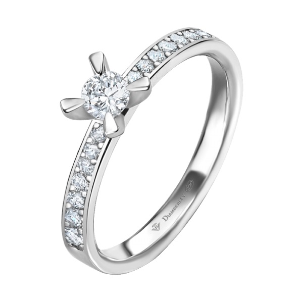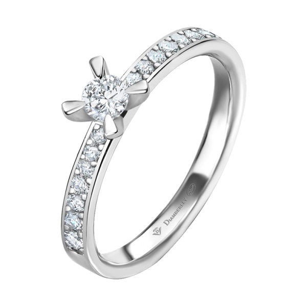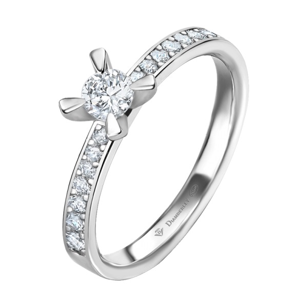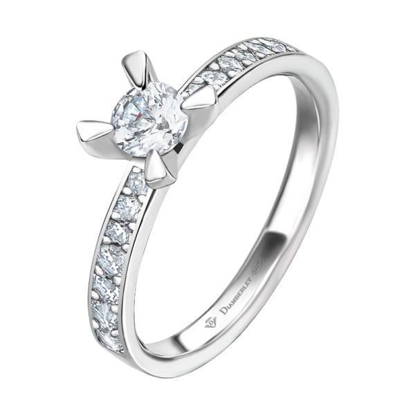 Clásico Solitario de Compromiso en oro blanco pulido de 18 kts. de la marca Diamberley. La joya tiene un diamante central talla brillante engastado en 4 garras y dos filas de diamantes más pequeños en el brazo con diferentes quilates a elegir.