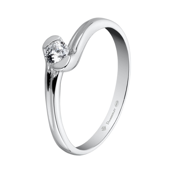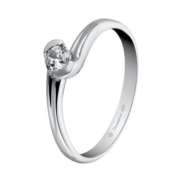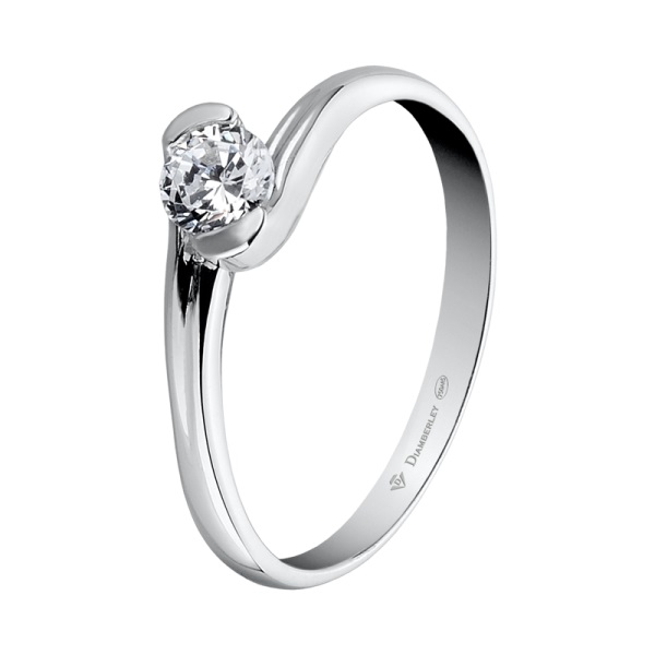 Clásico Solitario de Compromiso en oro blanco pulido de 18 kts. de la marca Diamberley. La joya tiene un diamante central talla brillante engastado con diferentes quilates a elegir.