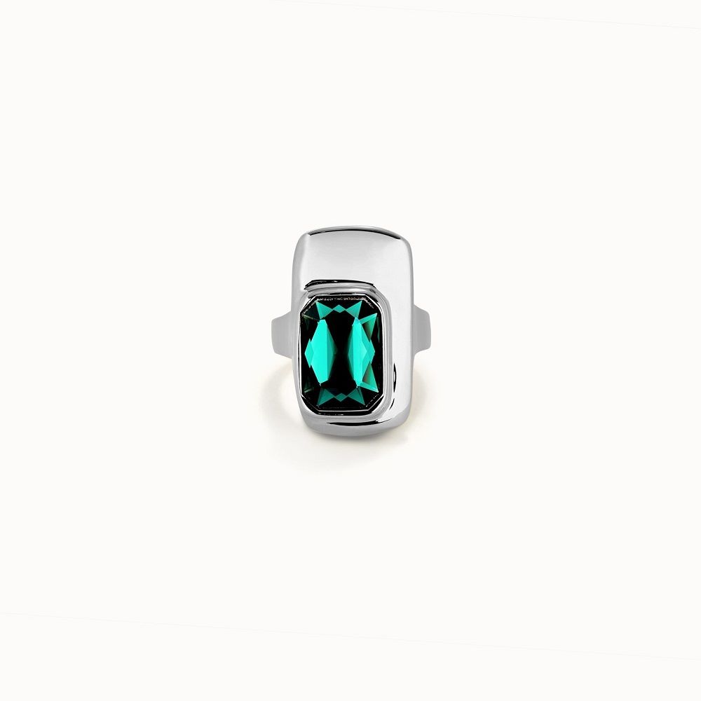 Anillo Mujer UNOde50 ANI0829VRDMTL de la colección Ser Magnética. Anillo bañado plata de ley con cristal facetado verde central. Elaborado en España, en un proceso 100% artesanal. Estas joyas son una exposición de arte compuesta por pulseras, anillos, collares y pendientes donde cada joya es una obra de arte en la que encontramos cristales tallados estilo esmeralda y piezas con capas de formas geométricas. Descubre ser magnética.