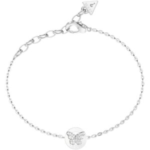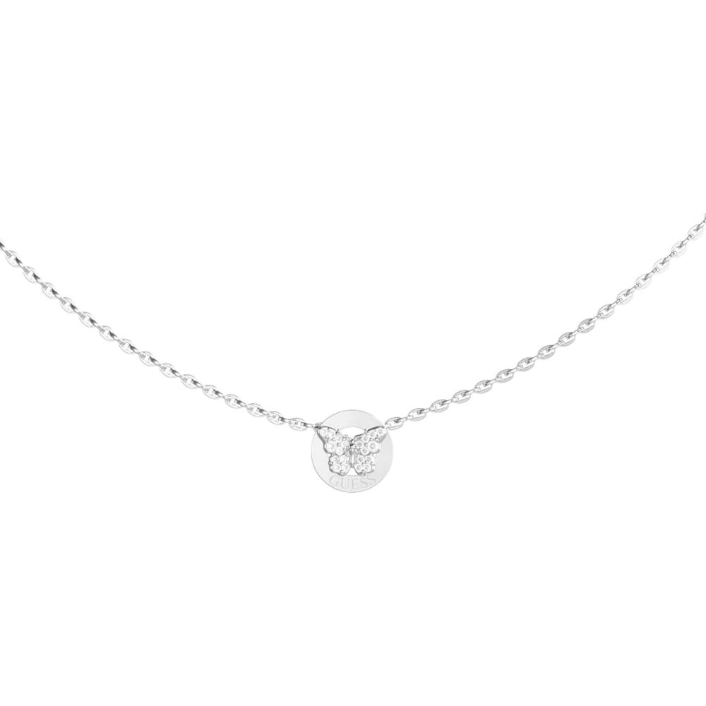 El collar GUESS JUBN06134JWRHT-U es una joya femenina elegante y sofisticada, pensada para aportar un toque distintivo a cualquier look. Su colgante circular en acabado plateado de alto brillo incorpora el logo GUESS acompañado de una delicada mariposa engastada con circonitas blancas, que añade luminosidad y un aire refinado al diseño.