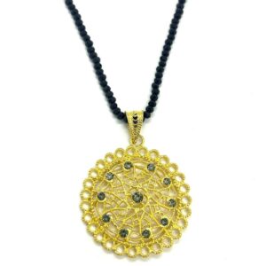 Colgante Filigrana Charra JT4827C-V en Plata de Ley chapada en oro de 23 kilates. Precioso colgante circular decorado con 11 swarovski en color esmeralda y gargantilla de strass en color verde de 50 cm de largo. El colgante mide 5,5×4 cm. Una forma diferente y útil de llevar la filigrana charra fabricada de forma artesanal.