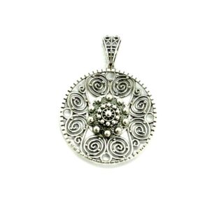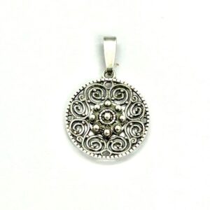 Colgante Filigrana Charra JTS1945-CH en Plata de Ley chapada en oro de 23 kilates. Precioso colgante circular de 15mm de diámetro con un botón charro en el centro. Su medida es de 15 mm. Añade un toque artístico y original a tu estilo con este colgante que hace un guiño al sombrero mexicano. Una forma diferente y útil de llevar la filigrana charra fabricada de forma artesanal.