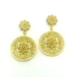 Pendiente Filigrana Charra JTPE4682CH realizado en Plata de Ley chapado en oro de 23 kilates. Pendiente de filigrana con marquesitas, pequeñas piedras brillantes, a menudo de un color grisáceo plateado. Su medida es de 6 cm y llevan cierre de omega para mayor seguridad. Una forma diferente y útil de llevar la filigrana charra fabricada de forma artesanal.