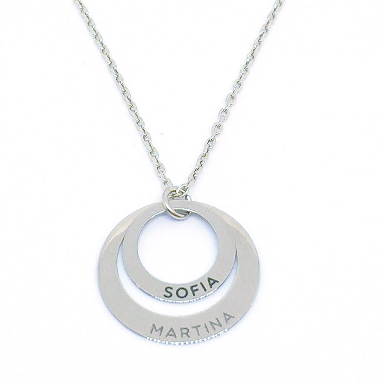 Collar círculos G859 en oro de ley 18 K con una medida de 2 cm. personalizable con nombres. Incluye cadena forzada de 1 mm. con posibilidad de dos largos, 40 cm y 45 cm. Acabado en oro blanco o amarillo. Plazo de entrega aproximado 7 a 10 días. Indicar los nombres al realizar el pedido.