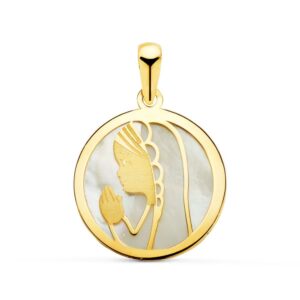 Medalla fabricada en oro amarillo de 1ª Ley 18 kilates (750 milésimas). Medalla con forma de gota con la silueta de la Virgen niña en relieve y cerco con acabado pulido sobre base de nácar y una circonita. La trasera del colgante presenta un diseño calado, en la cual se puede grabar 2 iniciales, debido a su limitado espacio. Tiene un diámetro de 18×16 mm.