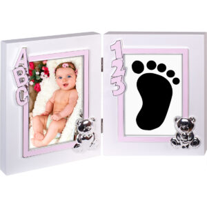 Marco De Fotos Infantil Huella 09510-A. Portafotos doble en blanco con detalles en esmalte color azul y osito plateado, con espacio para una imagen y por la otra parte contiene una masilla en la cual se puede inmortalizar la huella del bebe.