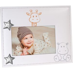 Marco De Fotos Infantil Huella 09510-R. Portafotos doble en blanco con detalles en esmalte color rosa y osito plateado, con espacio para una imagen y por la otra parte contiene una masilla en la cual se puede inmortalizar la huella del bebe.