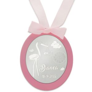 Medalla para cuna redonda realizada en plata de ley 925 mm. con el detalle de una cigüeña y reloj para grabar la hora de nacimiento del bebé.