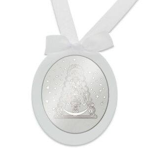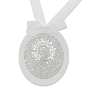 Medalla para cuna realizada en plata de ley 925 mm. redonda con la imagen de La Virgen Del Rocío. En muchas culturas existe la tradición de regalar una medalla a los bebes recién nacidos ya que representan un símbolo de protección y buenos deseos para el nuevo miembro de la familia. Es un símbolo de fe y confianza en la protección divina. Es un regalo tradicional en bautizos y fiestas de presentación del bebé.