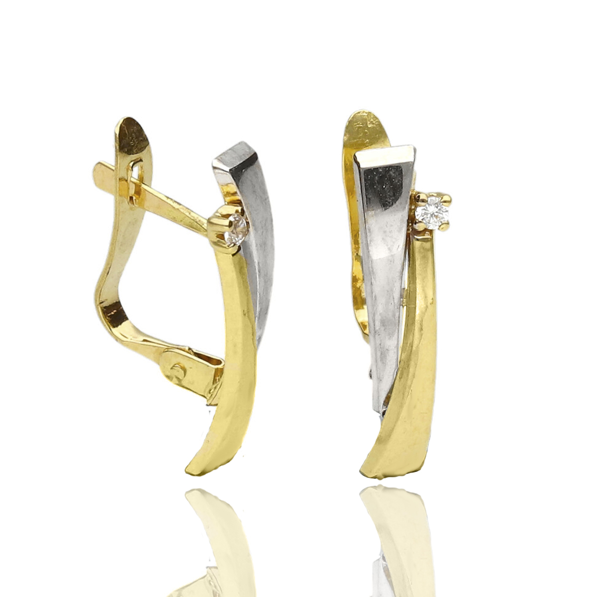 Pendientes para mujer en oro amarillo de 1ª ley 18 kilates (750 milésimas). Preciosos pendientes con acabado bicolor realizados en oro amarillo y oro blanco pulido con detalle de una circonita blanca.