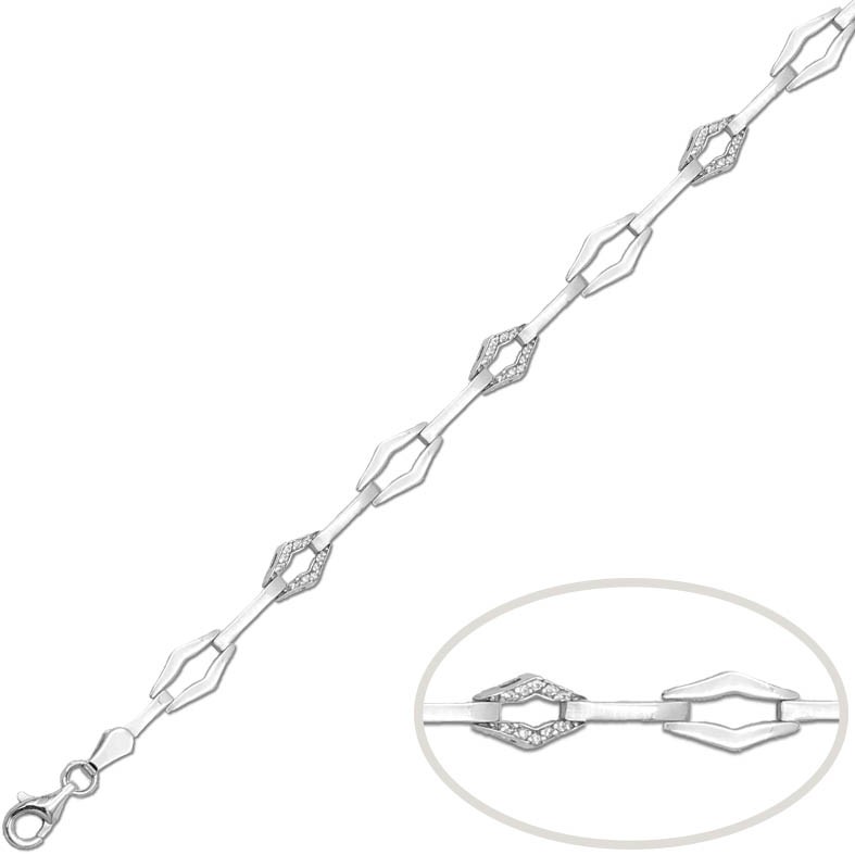 Pulsera realizada en oro blanco de ley 18k con eslabones lisos combinados con eslabones con circonitas. Ancho de las piezas 6mm. y medida de la pulsera 19 cm. Peso estimado 7 gramos. Cierre de mosqueton.