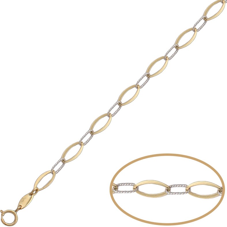 Pulsera realizada en oro de ley 18k amarillo y oro blanco tallado. Terminacion en mate y brillo. Ancho de las piezas 4mm. y medida de la pulsera 19 cm. Peso estimado 1,55 gramos. Cierre de mosqueton.