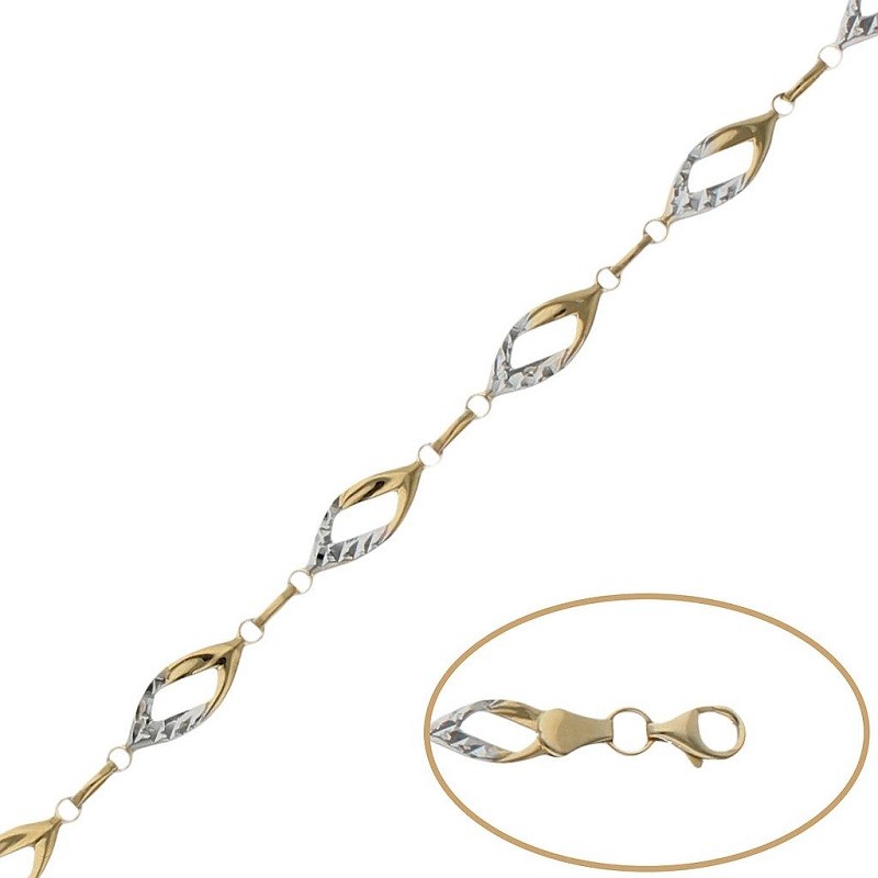 Pulsera realizada en oro de ley 18k amarillo y oro blanco tallado. Ancho de las piezas 5mm. y medida de la pulsera 19.50 cm. Peso estimado 3,9 gramos. Cierre de mosqueton.