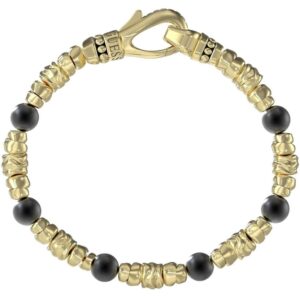 Fabricada en acero inoxidable en color dorado, ofrece una excelente resistencia al uso cotidiano y un acabado de alta calidad que mantiene su brillo con el paso del tiempo. Su longitud es de 19 cm, y lleva cierre de mosquetón, garantiza una colocación cómoda en la muñeca masculina.