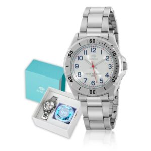 Reloj Marea para niño de la colección de comunión fabricado en acero inoxidable plateado. Estamos ante un reloj analógico tres agujas de diseño elegante y atractivo compuesto por caja de 34mm de diámetro, esfera azul con números en color plata y agujas luminiscentes movidas por mecanismo de cuarzo analógico. Todo ello protegido por cristal mineral.