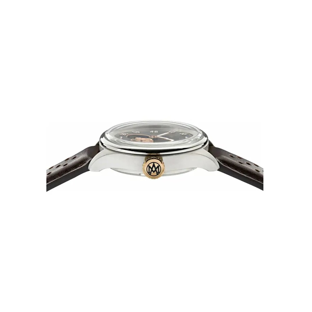 Caja de acero inoxidable de 41 mm. Correa de cuero marrón. Esfera negra. Sumergible 10 ATM. Movimiento automático de 3 manecillas. 3 años de garantía.