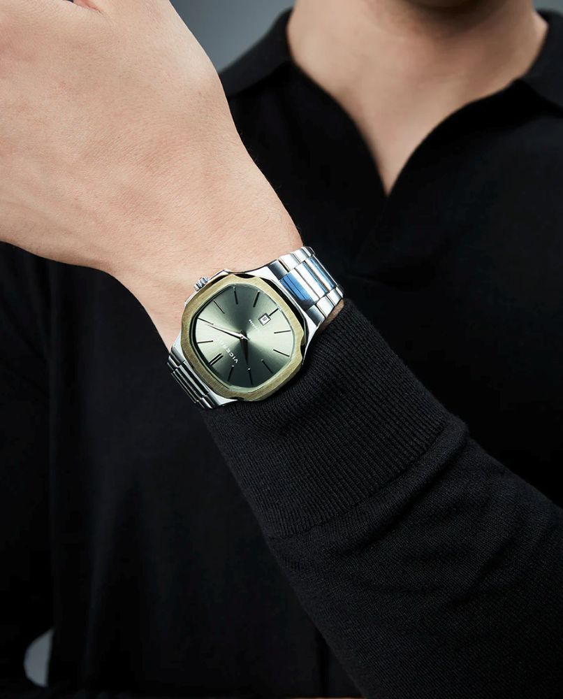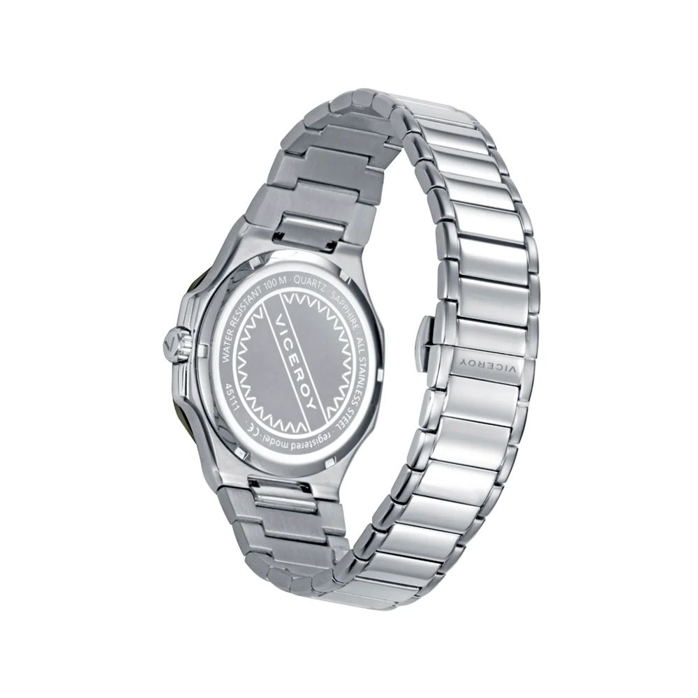 Reloj Viceroy Hombre 45111-67 Laura Escanes fabricado en acero inoxidable plateado y verde. Estamos ante un atractivo reloj compuesto por caja de 41mm de diámetro con bisel verde al igual que su esfera que cuenta con indicadores en forma de barras en plateado al igual que sus agujas movidas por mecanismo de cuarzo analógico con función de calendario. Todo ello protegido por cristal de Zafiro. Su brazalete lo forman eslabones plateados con cierre desplegable mediante doble pulsador. Resistente al agua hasta 10 ATM.