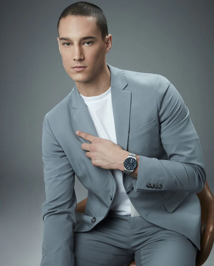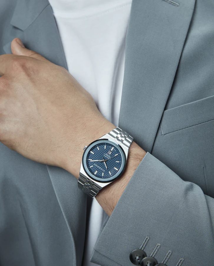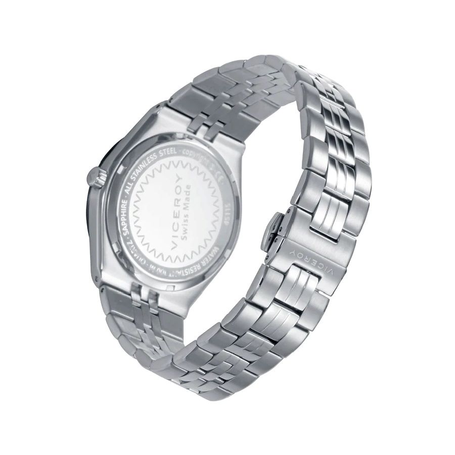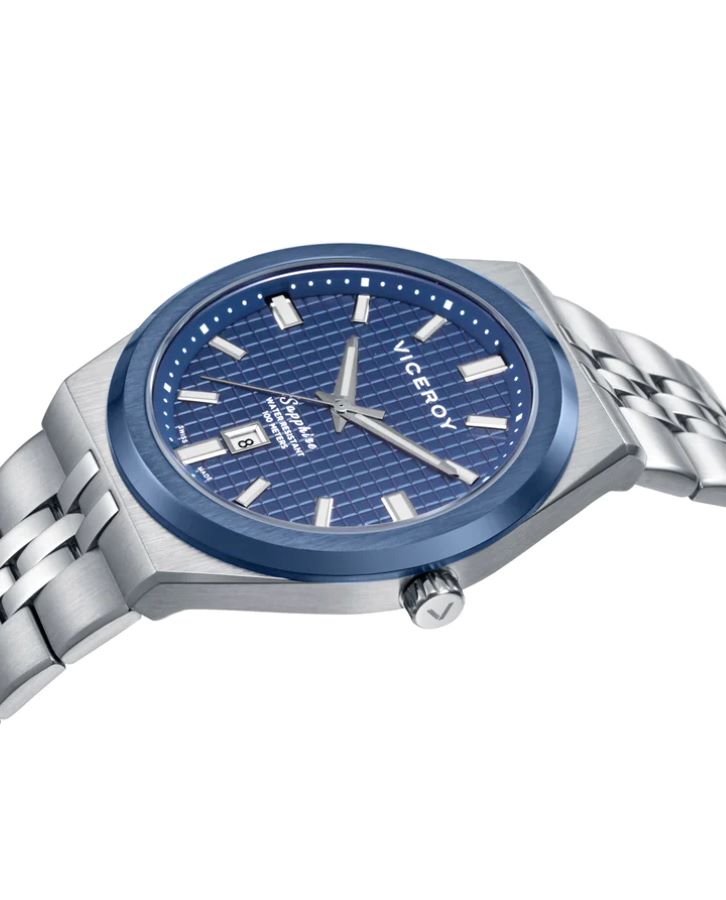Reloj Viceroy Hombre 45115-37 de la colección Swiss Made fabricado en acero inoxidable plateado. Estamos ante un reloj de diseño clásico y elegante compuesto por caja de 40mm de diámetro con original bisel en color azul a juego con la esfera que posee indicadores en formas de barras plateadas al igual que sus agujas movidas por mecanismo de cuarzo analógico suizo con función de calendario. Todo ello protegido por cristal de Zafiro. Su brazalete está formada por eslabones plateados con cierre desplegable mediante doble pulsador. Resistente al agua hasta 10 ATM.