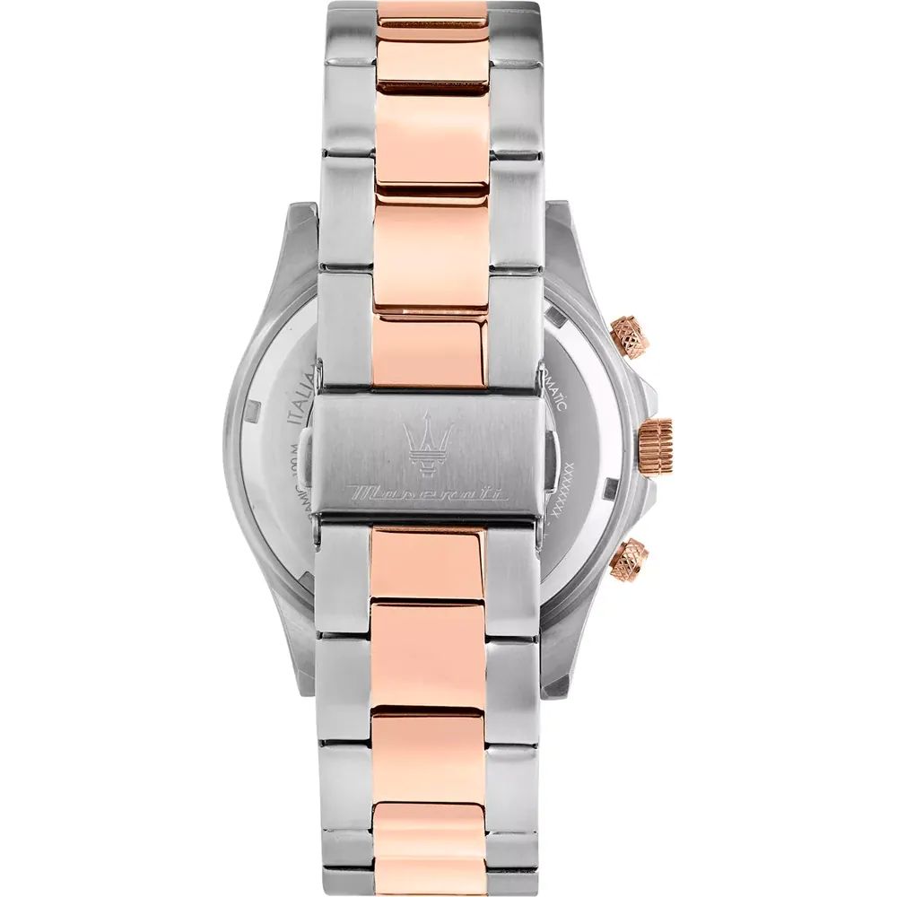 Reloj Maserati Hombre R8873600004 Cronógrafo de la colección Competizione. Espectacular reloj con caja de acero rosa y bisel cerámico en color verde a juego con su esfera. Tiene índices y agujas luminiscentes en color rosa, y la posición de la fecha a las a las cuatro. Su brazalete es en acero inoxidable bicolor con cierre de pulsadores. Su caja es de 43 mm , con cristal mineral y corona de rosca. Sumergible 10 Atm. El reloj se envía en su embalaje original, con una garantía de 3 años.