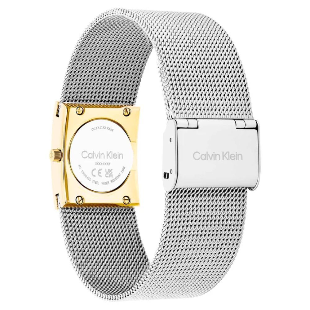 Reloj Calvin Klein Mujer 25100139. Original reloj realizado en acero bicolor, con brazalete de malla milanesa plateada ancha (2,5 cm), caja cuadrada  dorada y esfera redonda en color plateada, dándolo un aspecto muy elegante. Sumergible 3 Atm.