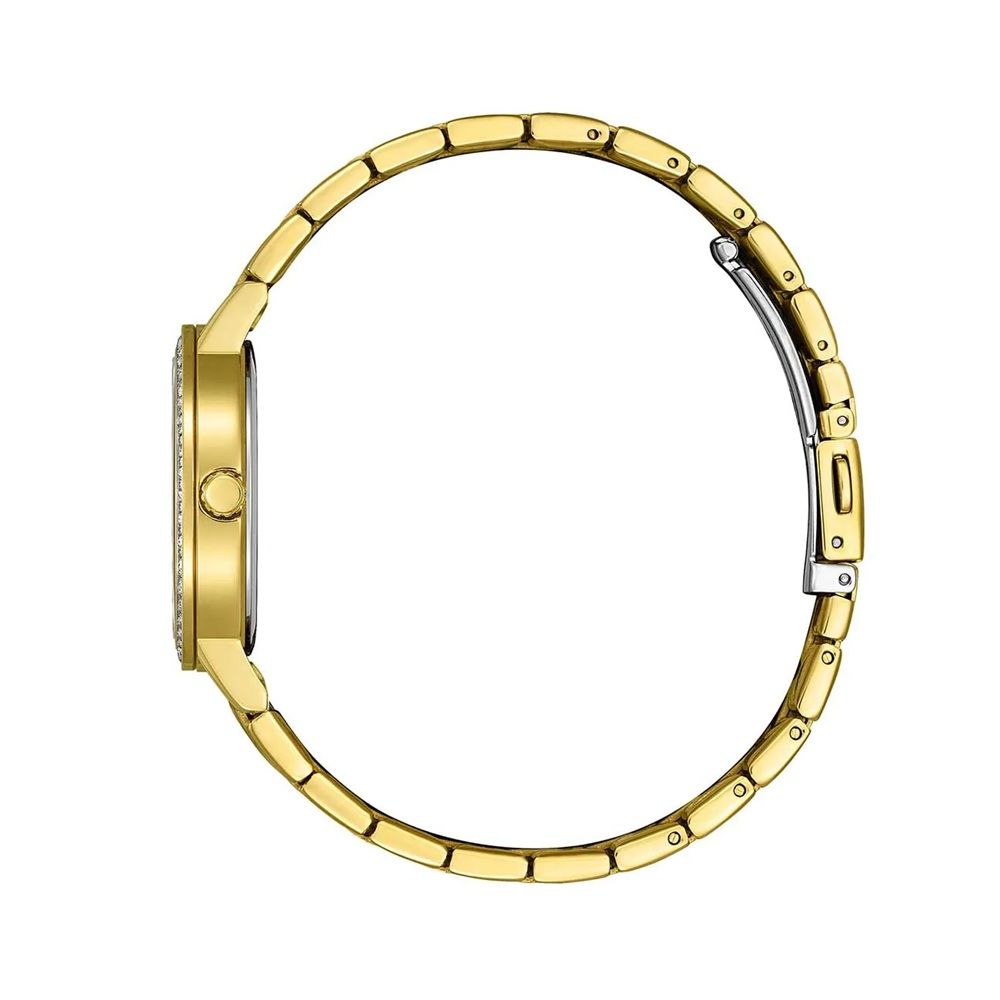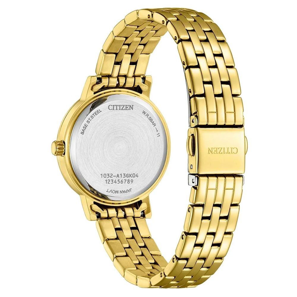 Reloj Citizen Mujer EL3102-50D. Elegante reloj de pulsera para señora, preciso movimiento de cuarzo, esfera blanca de nácar, agujas, números e índices dorados, decorados con 8 pequeños diamantes, segundero central, caja de acero inoxidable pulido, chapado en oro, bisel engastado con brillantes cristales, corona estriada, cristal mineral resistente a los arañazos, pulido, brazalete de acero inoxidable chapado en oro, cierre desplegable de seguridad con logotipo, hermético hasta 5 bar, anchura (sin corona) 31 mm, altura 7 mm.