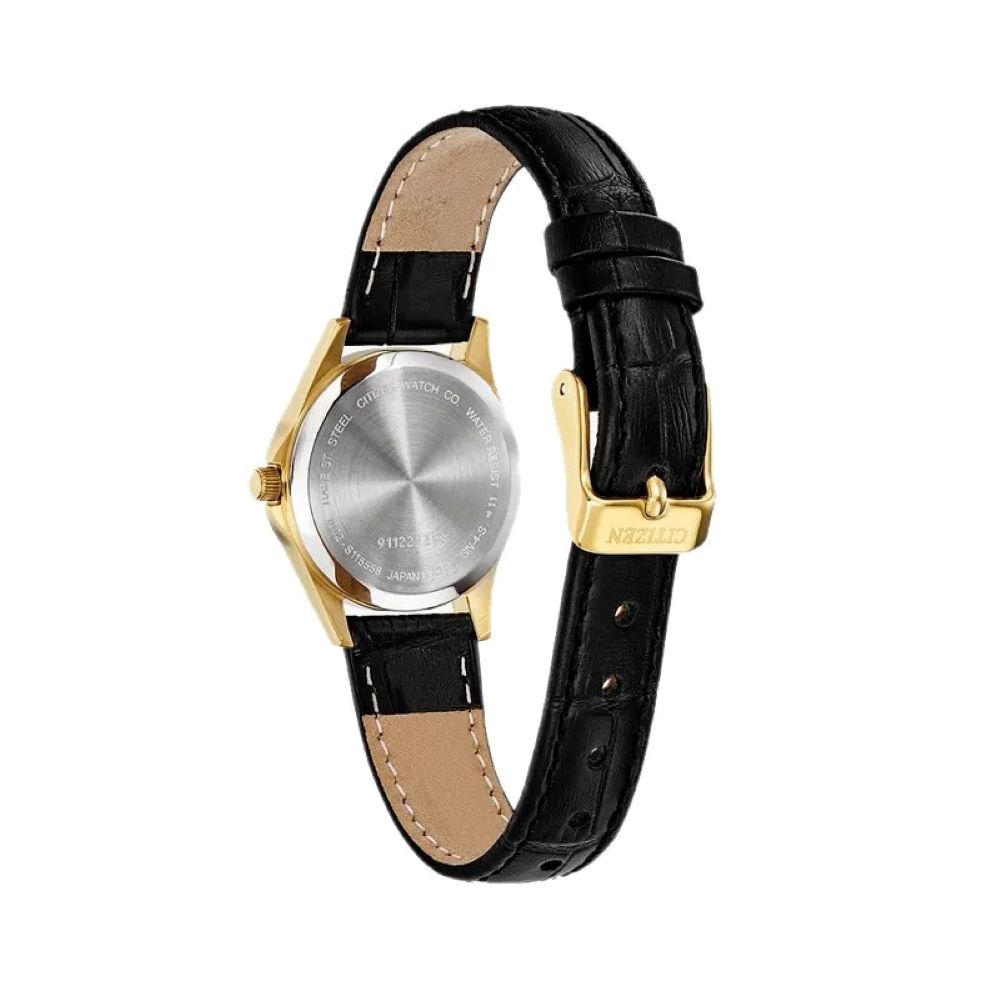 Reloj Citizen Mujer EQ0593-26Aanalógico. Caja de acero chapado dorado con correa de piel en color negra. Corona protegida cambio de hora en la posición de las tres. Esfera blanca con números arábigos. Agujas luminiscentes. Doble calendario en la posición de las tres. WR 5 bar. Diámetro de la caja 28 milímetros, grueso 9 milímetros. Estuche y garantía Citizen.